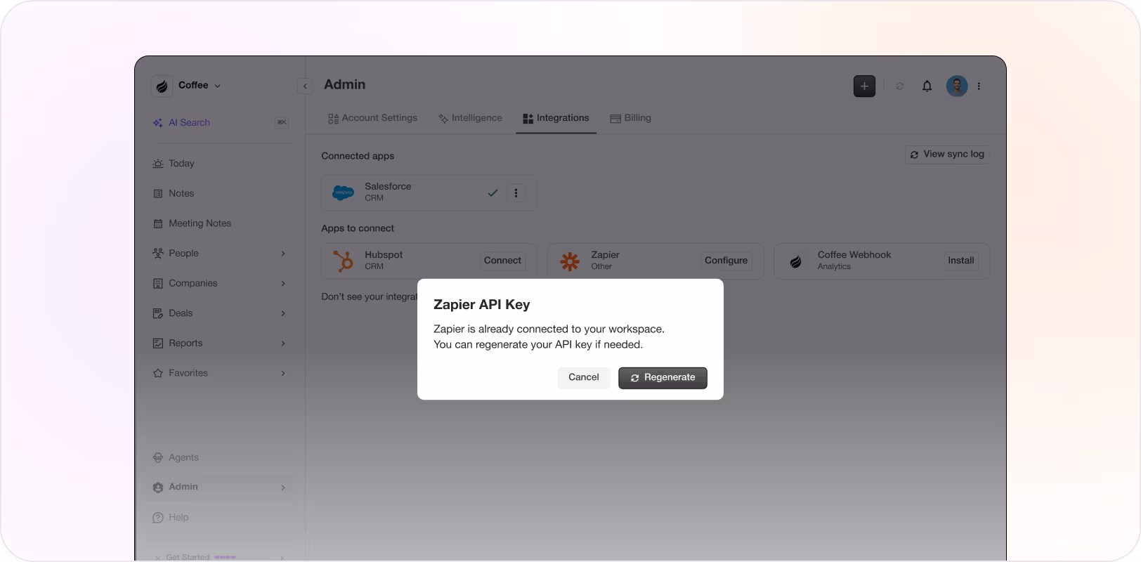 Coffee now connects with Zapier so you can plug your CRM workflows into thousands of apps. Automatically pull data from external systems into Coffee, push data from Coffee to other apps you use, or bring in notes or transcripts from call recorder or note-taking app you’re already using, like Granola.